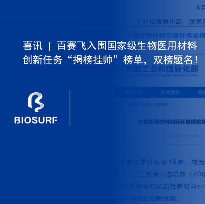 8月26日,工业和信息化部、国家药品监督管理局联合公示了生物医用材料创新任务揭榜挂帅(第二批)入围揭榜单位(全国86项),百赛飞凭借磷酰胆碱基聚合物和抗血栓新材料ε-赖氨酸基聚合物2项创新任务双榜题名。